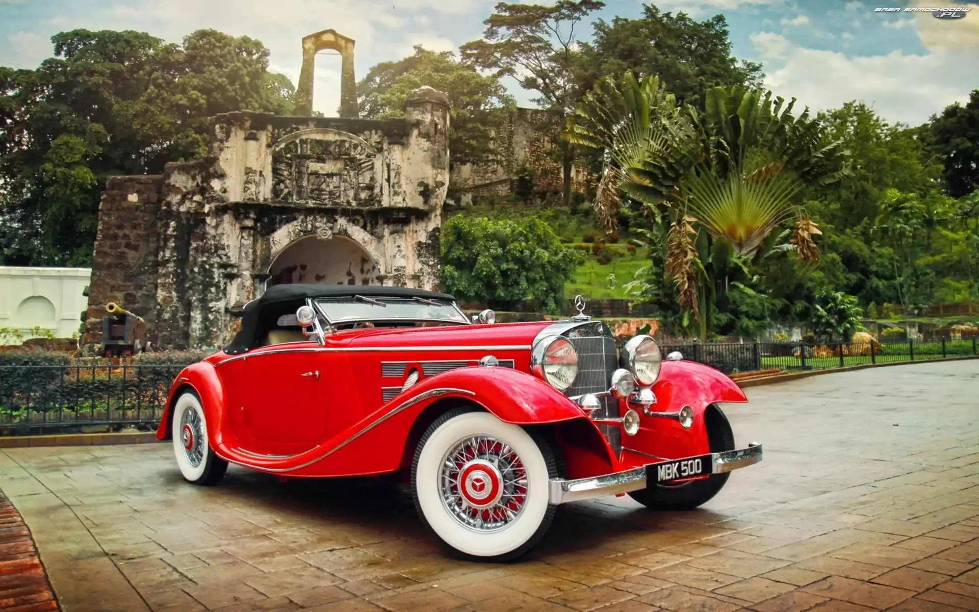 Samochód: Czerwony, Drzewa, Mercedes, Parking