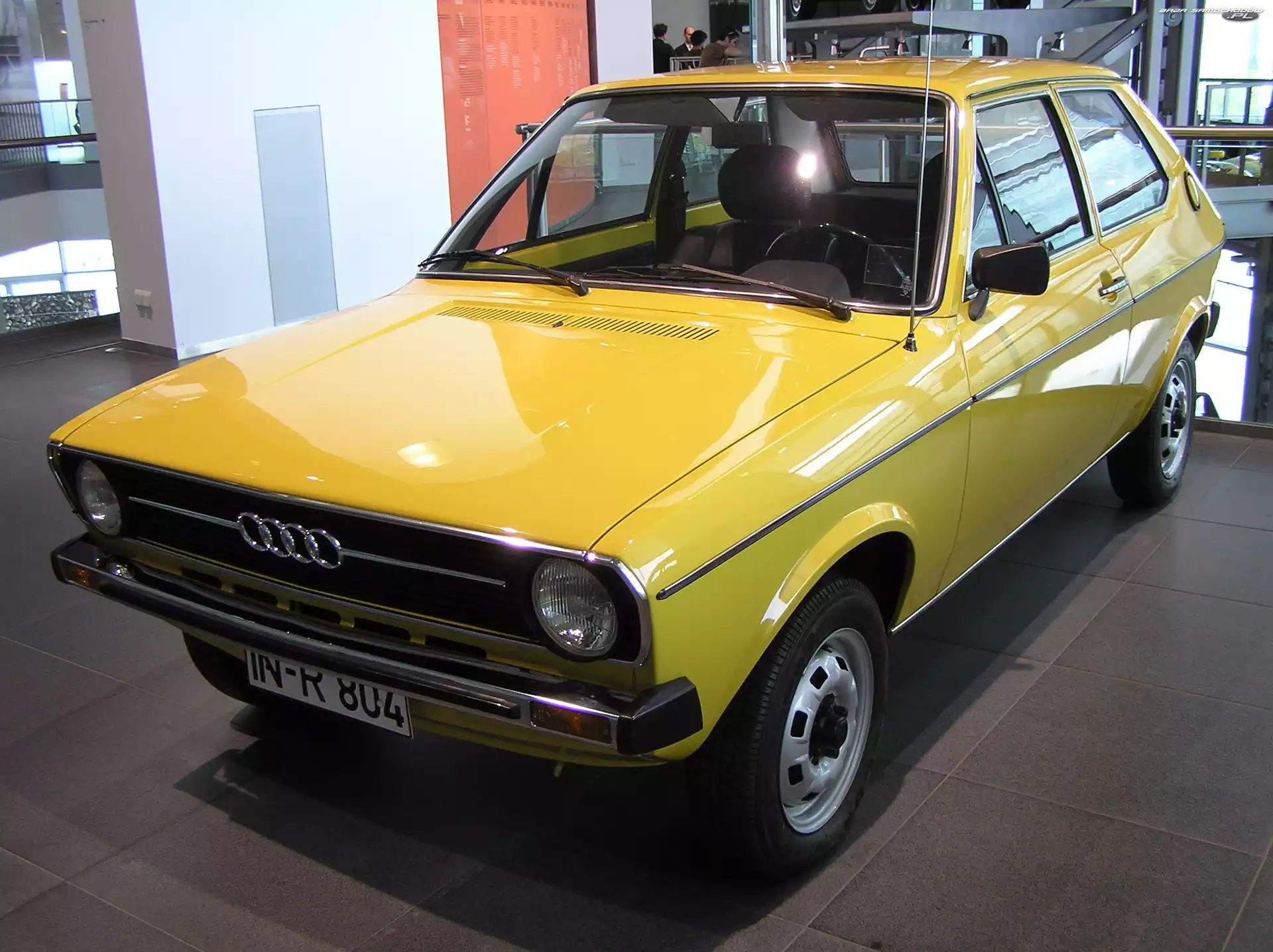 Hatchback, Audi 50 Drzwi, Audi 50 Reklama, Pomarańczowe, Audi 50 Wystawa, Audi 50, Salon Audi 50 Prezentacja, Audi 50, Wystawa Audi 50, Chrom, Przód, Zderzak